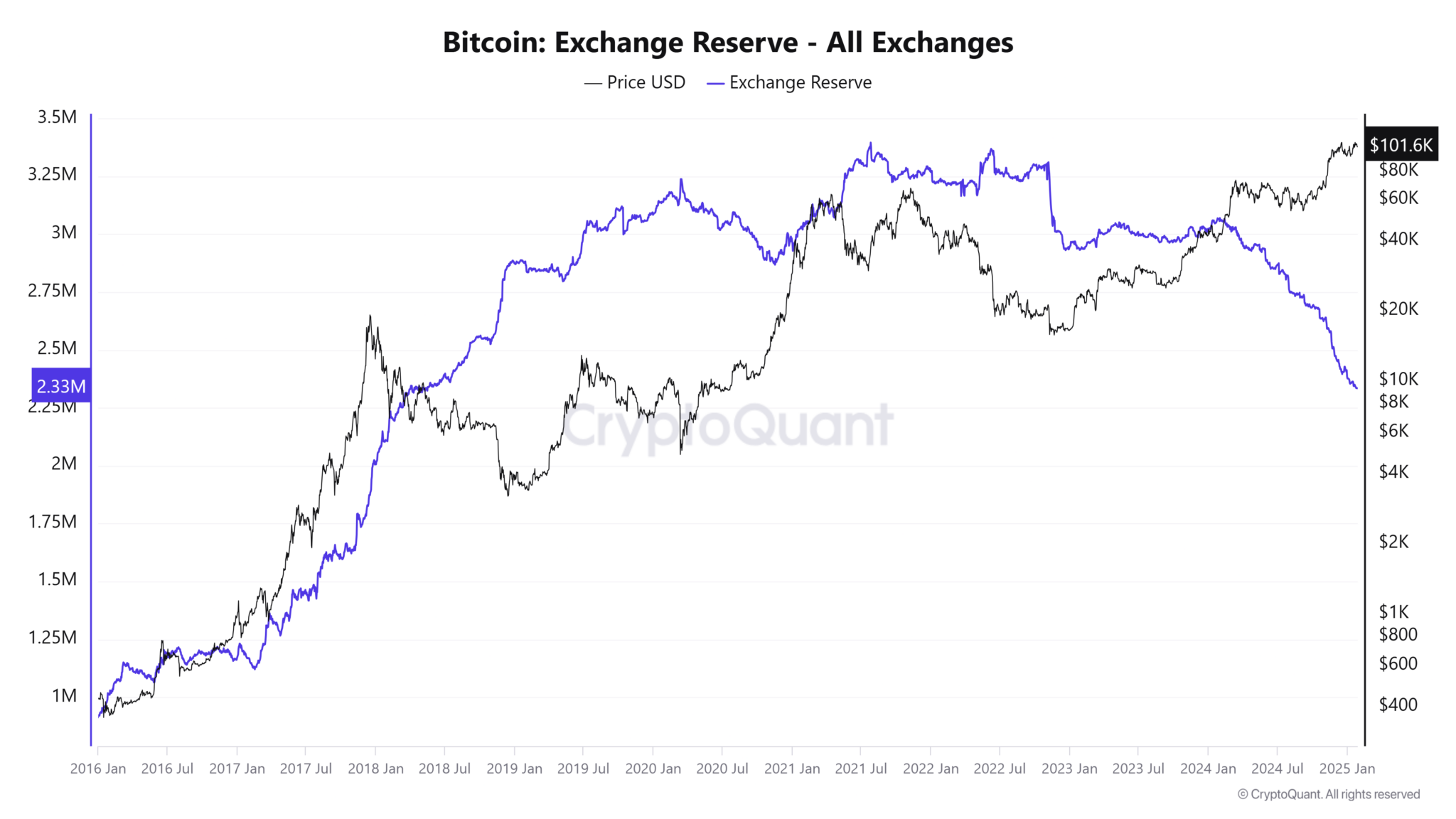 Резервы биткоин-бирж продолжают снижаться и в настоящее время находятся на многолетнем минимуме. На момент наблюдения на биржах находилось примерно 2,334 миллиона биткоинов. В последний раз резервы бирж были на таком низком уровне в 2018 году.