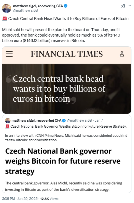 Алеш Михл, глава Чешского национального банка (CNB), предложил включить биткоин в резервную стратегию страны. По данным Financial Times, Михл предлагает, чтобы CNB выделил 5% своих резервов в размере 140 млрд евро в биткоин, что означает инвестиции в размере 7 млрд евро.