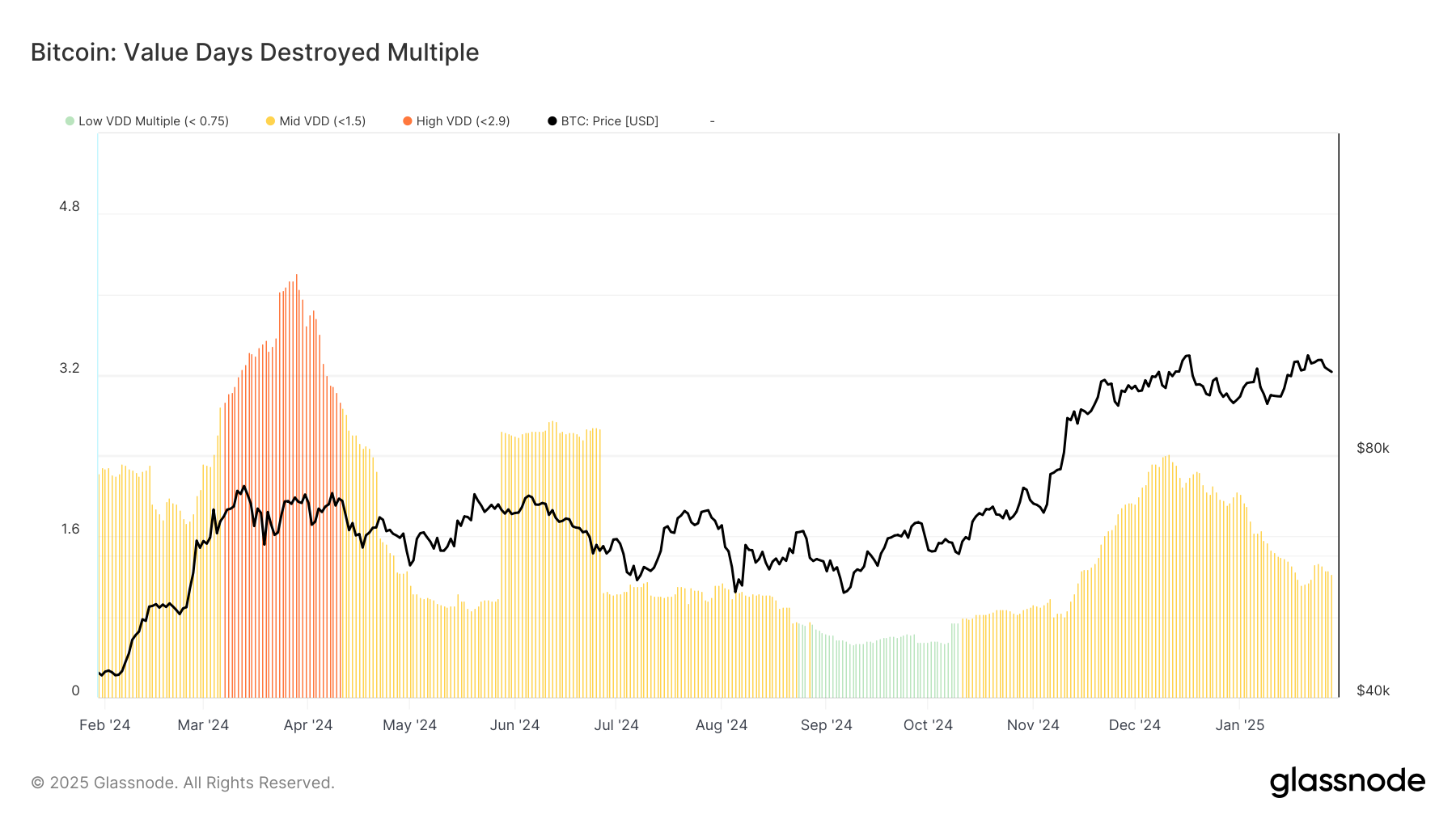 Метрика Value Days Destroyed Multiple (VDDM) является важным индикатором для отслеживания рыночных трендов. Она сравнивает монеты, потраченные за короткий срок, с годовыми средними значениями. Высокие значения (выше 1,4) указывают на разогревающийся рынок. Экстремальные значения (более 2,9) исторически отмечали циклические максимумы, сигнализируя о возможной коррекции.