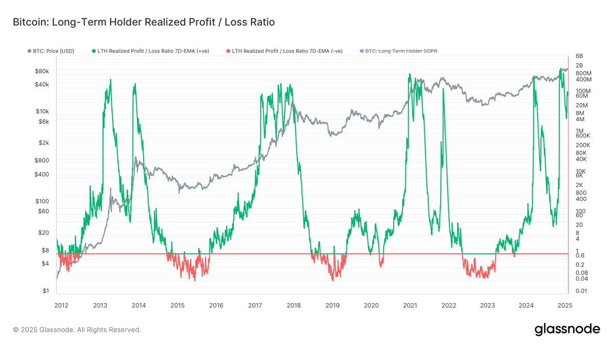 Объемы прибыли и убытков долгосрочных держателей биткоина указывает на то, что большинство LTH находится в прибыли. Об этом говорит высокий коэффициент этих двух метрик. Такой паттерн характерен для фаз бычьего рынка, с минимальным предложением в убытке, что усиливает тенденцию к накоплению.