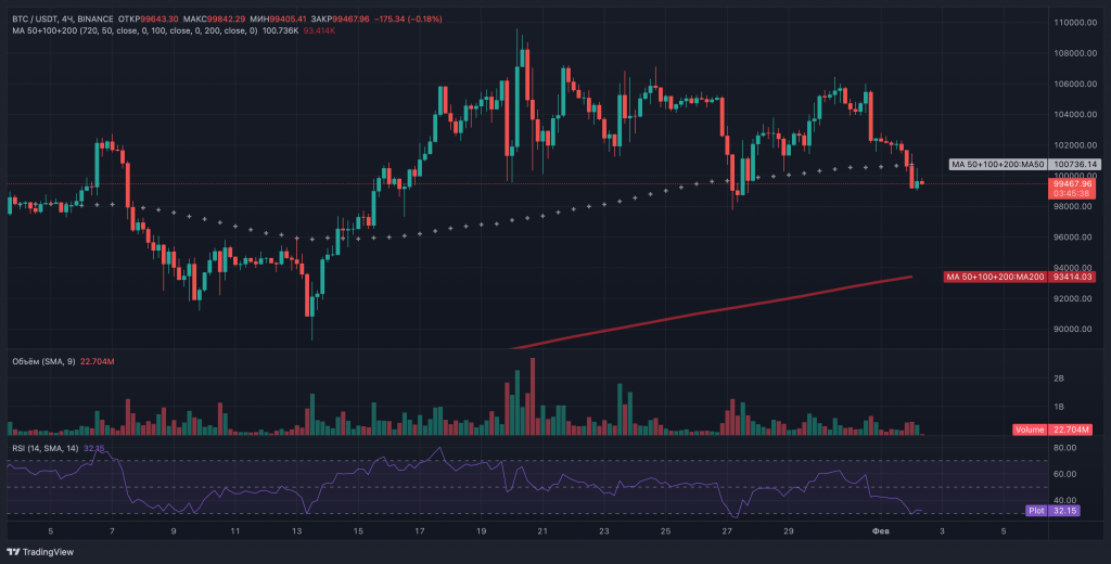 На фоне этих событий биткоин опустился до $99 031, впервые с 27 января пробив психологически важную отметку в $100 000. По данным CoinGlass, за четыре часа было ликвидировано длинных позиций на сумму $21 млн.