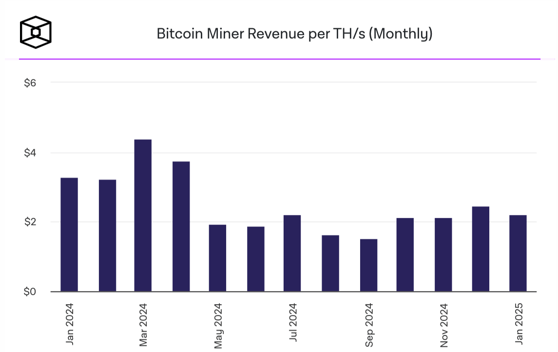 Средний доход майнеров Биткоина за терахеш вычислительной мощности по месяцам