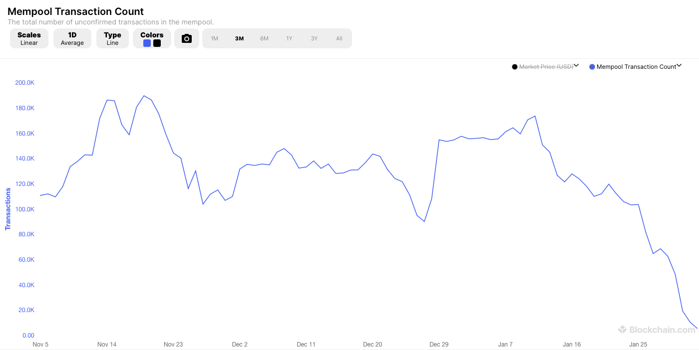 По данным портала blockchain.com, за последние три месяца количество транзакций в мемпуле снизилось почти в пять раз.