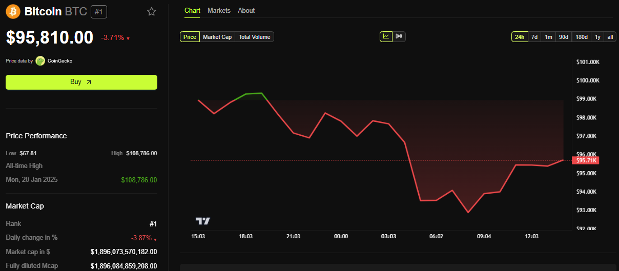 С воскресенья биткоин упал на 4,3%, опустившись ниже $93 000 впервые за три недели. К моменту написания материала цена криптовалюты восстановилась до $95 810.