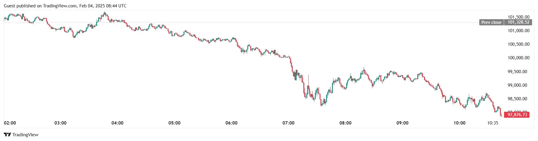 Биткоин на момент написания торгуется чуть ниже $98 000. На рынке снова прослеживается нисходящий тренд после роста в ночь на 4 февраля: