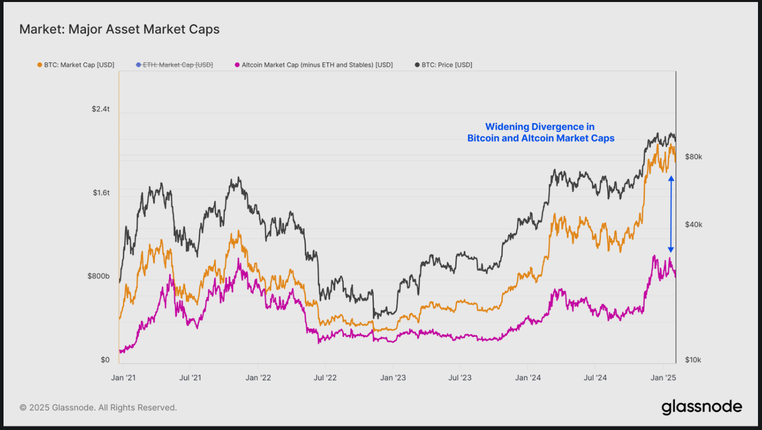 «Сравнивая капитализации с минимумами 2022 года: рыночная стоимость биткоина выросла с $363 млрд до $1,93 трлн (в 5,3 раза), а альткоинов (исключая Ethereum и стейблкоины) — увеличились с $190 млрд до $892 млрд (в 4,7 раза)», — отметили в Glassnode.
