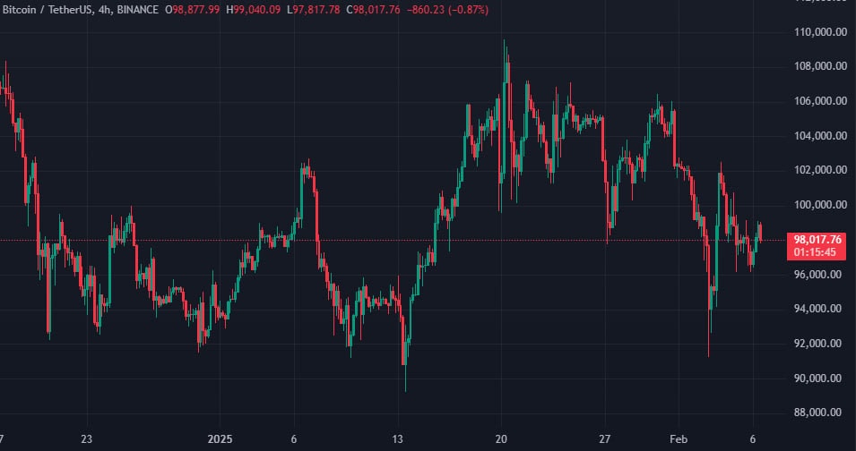 На момент написания биткоин торгуется вблизи отметки в $98 000:
