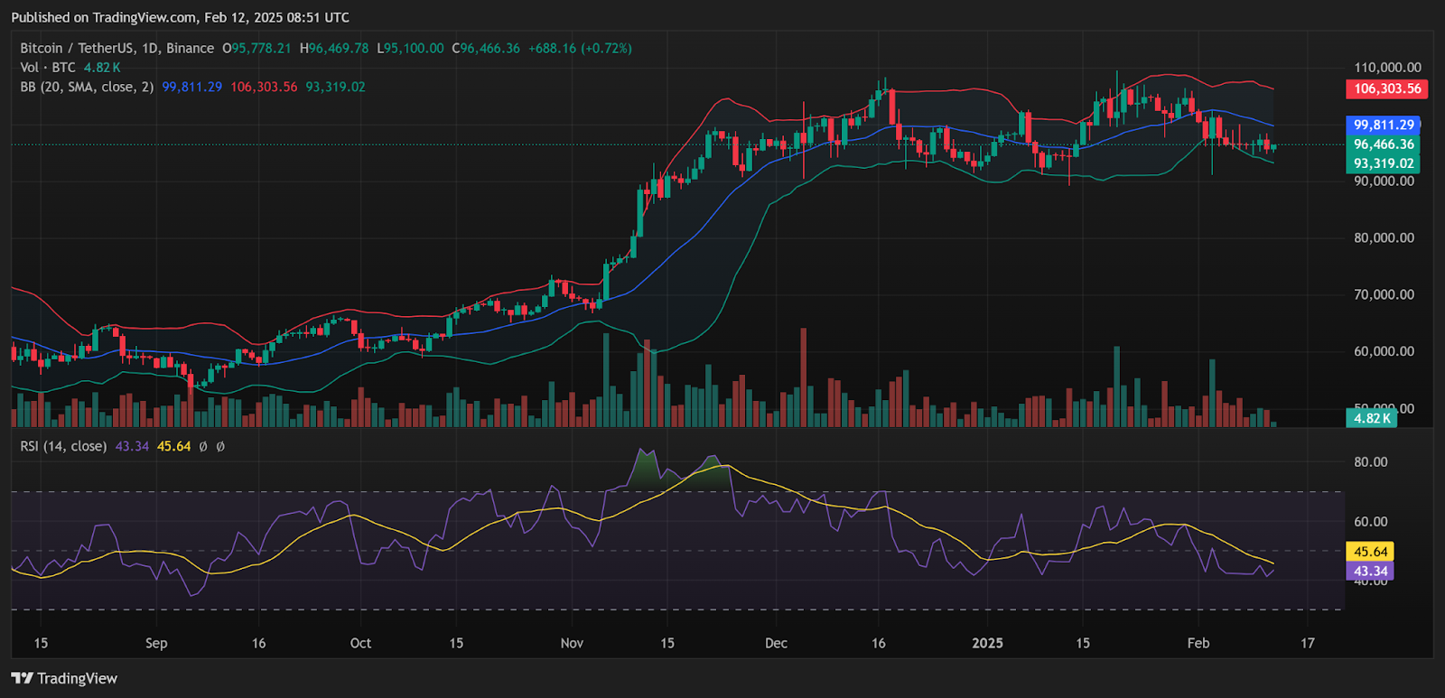 Согласно дневному графику, предоставленному TradingView ниже, полосы Боллинджера указывают на сжатие цен, с верхней полосой на уровне $106 303 и нижней полосой на уровне $93 319. Это говорит о том, что ситуация успокаивается с точки зрения волатильности, что может означать, что потенциальный прорыв в любом направлении весьма вероятен.