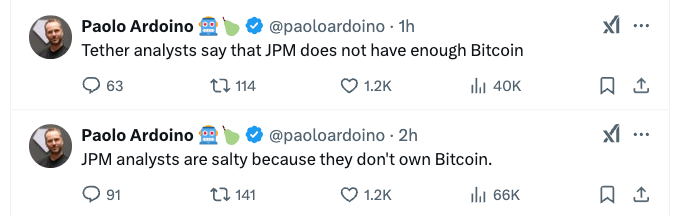 «Эти аналитики JPMorgan, похоже, немного завидуют, что они не купили Bitcoin дешево. Но очевидно, что они не понимают ни Bitcoin, ни Tether. И у них не будет дешевого события, чтобы купить Bitcoin. Никому их не жалко».