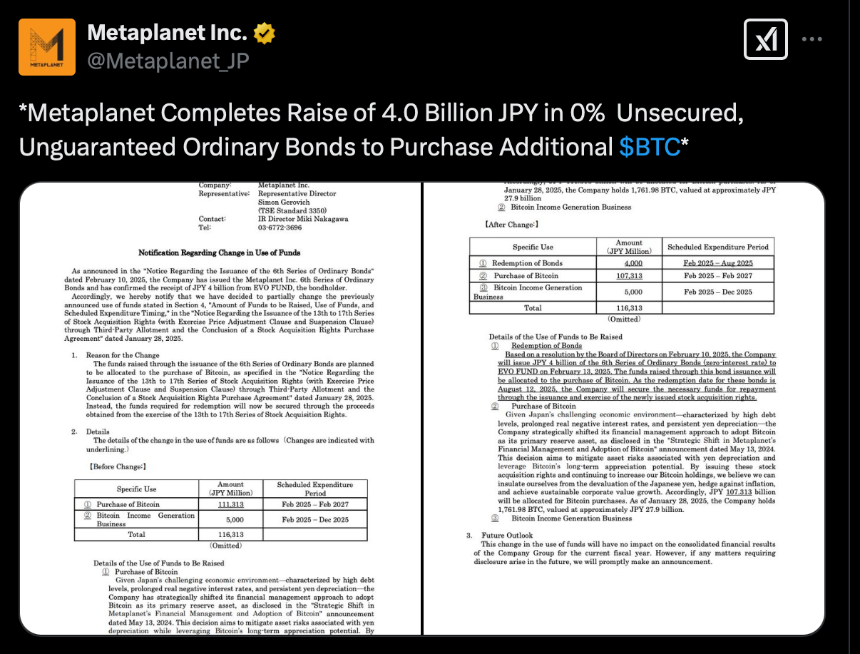 Metaplanet привлекла 4 млрд японских иен (26,1 млн долларов США) для покупки большего количества биткоинов, сообщила компания 12 февраля на X. 26,1 млн долларов США поступают в виде беспроцентных, необеспеченных и негарантированных облигаций.