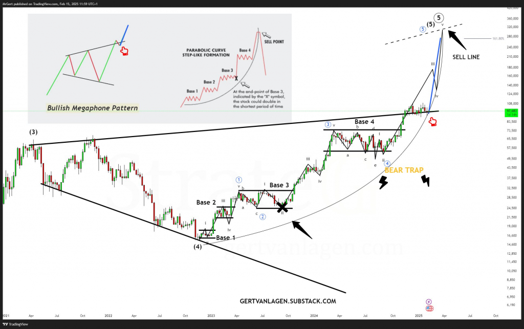 Технический анализ биткоина демонстрирует формирование бычьего паттерна «мегафон», который может привести к значительному росту основной криптовалюты. По оценкам аналитика Герта ван Лагена (Gert van Lagen), цена биткоина, торгующегося сейчас на уровне $96 974, может достичь $270 000–300 000 к 2025 году.