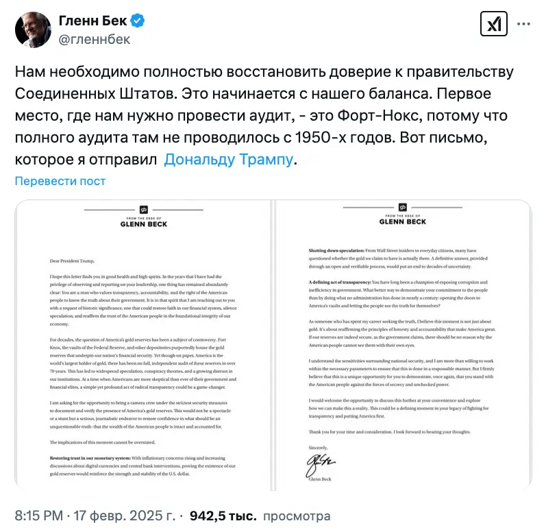 «Я прошу предоставить мне возможность пригласить съемочную группу в соответствии со строжайшими мерами безопасности для документирования и проверки наличия золотых запасов Америки», — сказал Бек в письме, опубликованном на X.