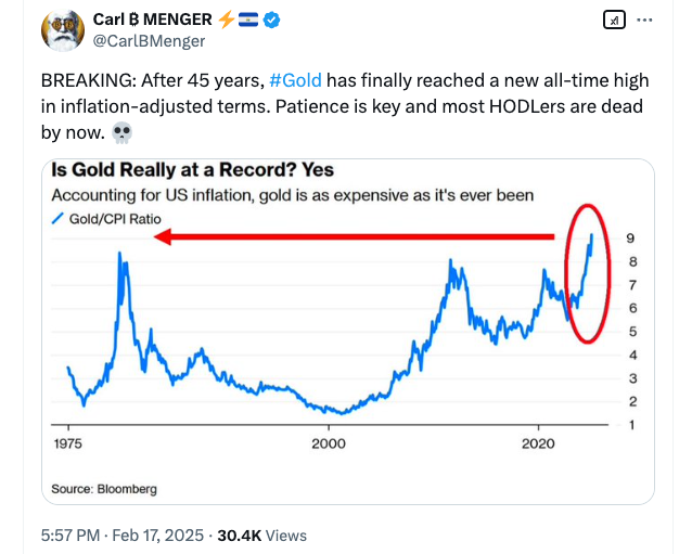 Тем временем спотовое золото набирает обороты, установив новый исторический максимум выше 2940 долларов на прошлой неделе и, как сообщается, достигнув нового рекорда с поправкой на инфляцию недавно.