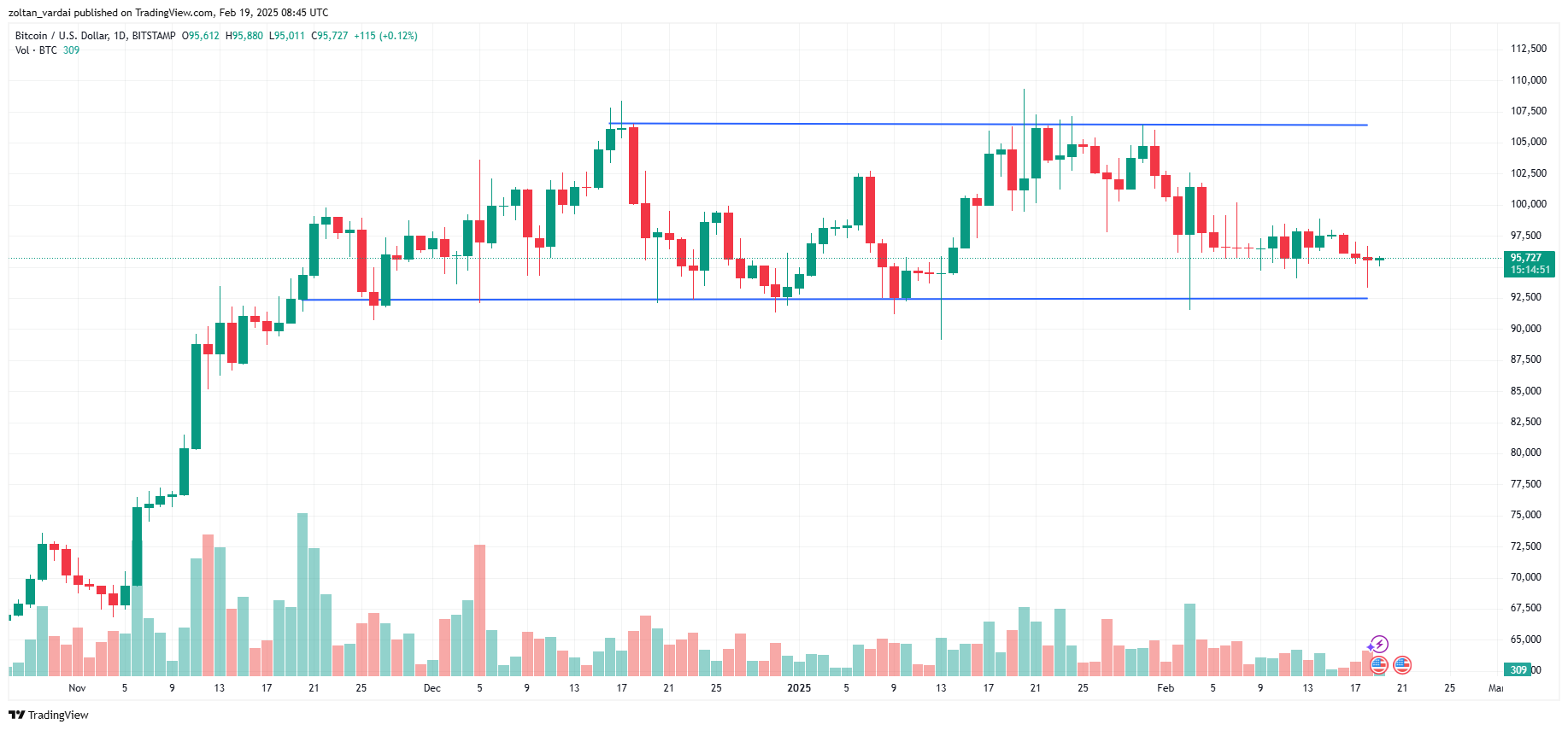 По данным TradingView, биткоин находится в диапазоне уже более двух месяцев, торгуясь между поддержкой $92 400 и сопротивлением $106 500 с 18 декабря.