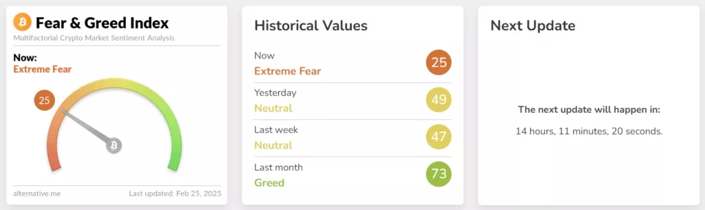 На фоне новости индекс страха и жадности упал до 25 пунктов, что является сигналом «крайнего страха». Показатель находится на отметках начала сентября 2024 года.