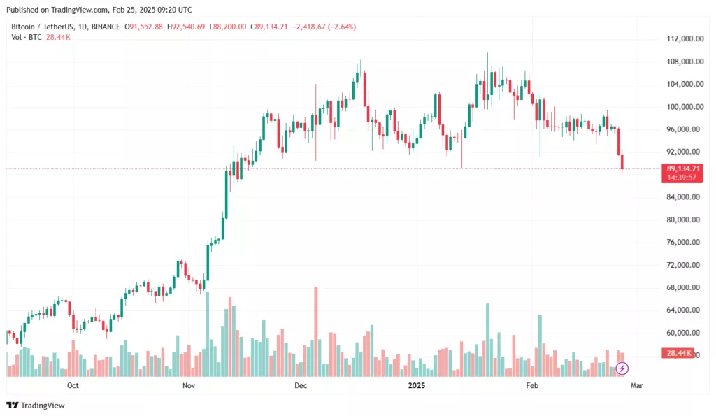 На момент написания биткоин торгуется по $89 116, теряя в стоимости 2,68% за сутки.