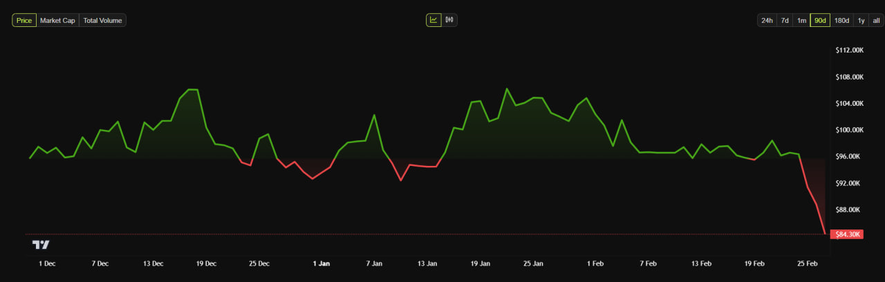 Недавняя волатильность криптовалютного рынка связана с торговыми спорами США. Ранее рынок частично восстановился после отсрочки тарифов на Канаду и Мексику, но заявление Трампа о новых 25 % тарифах для ЕС вызвало новую волну распродаж.