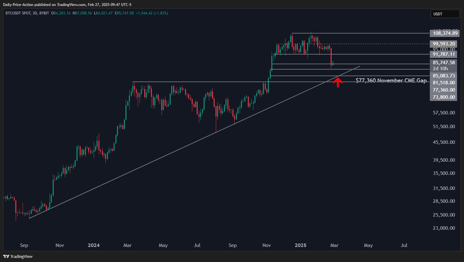 «Биткоин выглядит решительно настроенным закрыть ноябрьский гэп CME на уровне $77 360, который может пересекаться с линией тренда сентября 2023 года», — продолжил эту тему популярный трейдер Джастин Беннетт (Justin Bennett), сопровождая свое сообщение иллюстративным графиком. «Биткоин выглядит решительно настроенным закрыть ноябрьский гэп Чикагской товарной биржи на уровне $77 360, который пересекается с линией тренда сентября 2023 года. Вероятно, в марте будет некоторое восстановление от этой зоны, но месячный график выглядит склонным к развороту вниз, если только BTC каким-то чудом не закроет февраль выше $92 000. Шансы на такой исход невелики»».