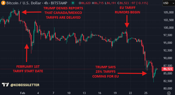 Цена биткоина опустилась ниже $80 000 после того, как президент США Дональд Трамп подтвердил введение новых торговых пошлин против Канады и Мексики с начала марта. Этот шаг оказал мгновенное давление на криптовалютный рынок, прервав краткосрочное восстановление цены главной криптовалюты.