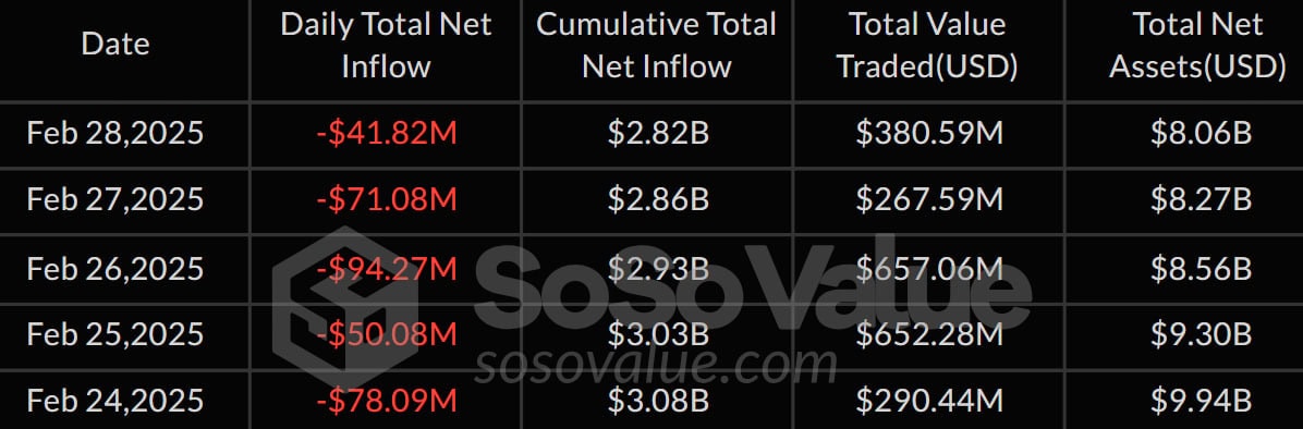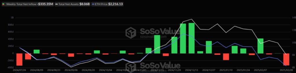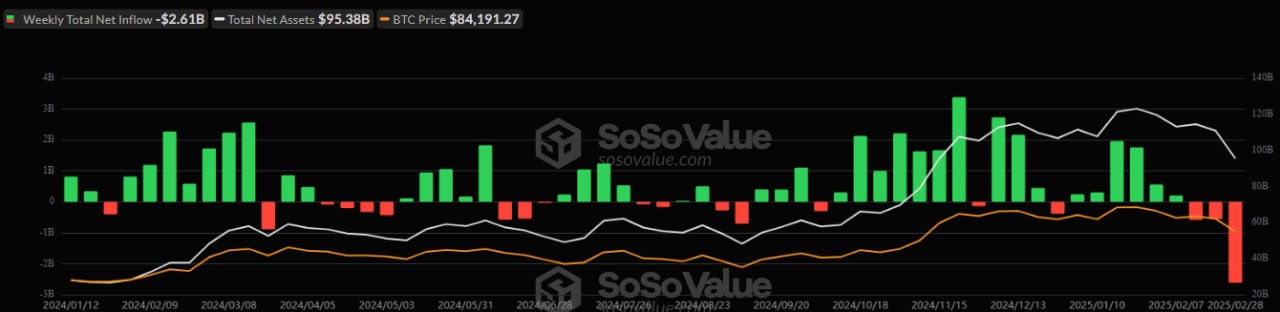 Спотовые биткоин- и Ethereum-ETF отметились отрицательной динамикой в разрезе недели. В период с 24 по 28 февраля 2025 года чистый отток капитала из спотовых биткоин-ETF достиг исторического максимума — $2,61 млрд. Из продуктов на базе Ethereum вывели $335,35 млн, это худший показатель с июля 2024 года.