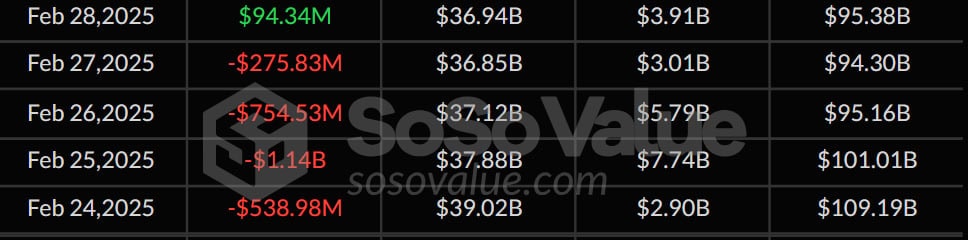 В фондах на базе Ethereum негативная динамика продолжалась всю неделю. Больше всего средств вывели 26 февраля — $94,27 млн.