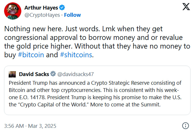 Не все в индустрии восприняли заявление Трампа всерьез. Артур Хейес, сооснователь BitMEX и глава Maelstrom Fund, считает, что без одобрения Конгресса инициатива ничего не значит.