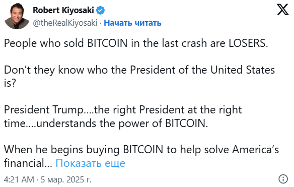 Интересно, что Кийосаки связывает будущее первой криптовалюты с политикой, считая, что президент США Дональд Трамп интуитивно чувствует потенциал цифровых денег. Бизнесмен уверен: когда Трамп решит использовать биткоин как инструмент для стабилизации американской экономики, именно владельцы этой криптовалюты окажутся в выгодной позиции.