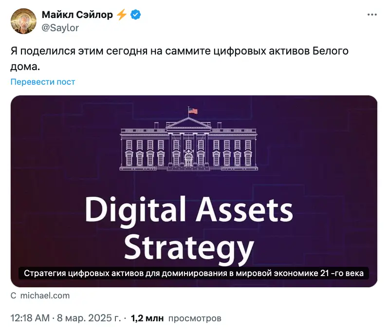 Сэйлор представил документ президенту США Дональду Трампу, руководителям правительства и мировым лидерам криптовалют на саммите по криптовалютам в Белом доме 7 марта.