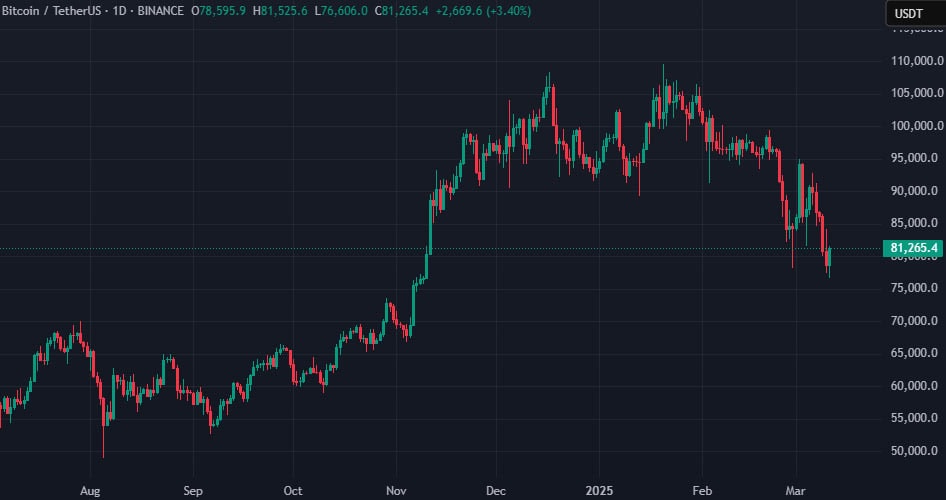 Отметим, на момент написания первая криптовалюта торгуется вблизи отметки в $81 300: