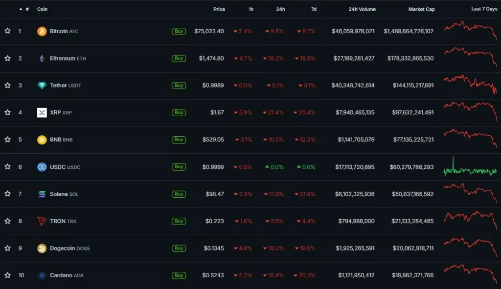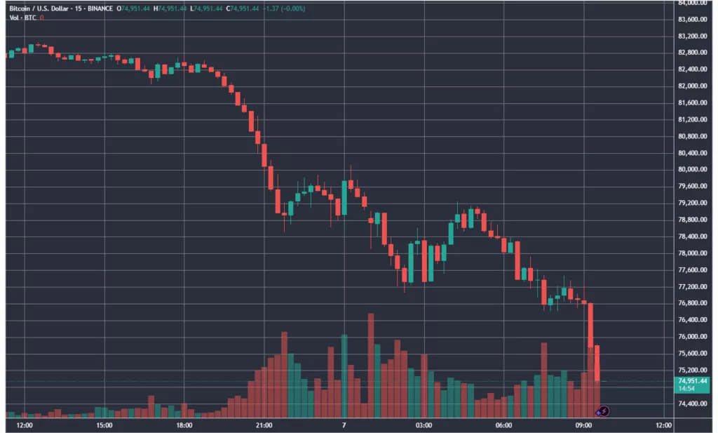 Вечером 6 апреля цена первой криптовалюты перешла к падению. На момент написания котировки находятся на уровне ~$74 950.