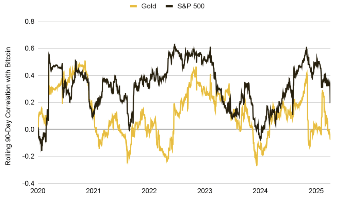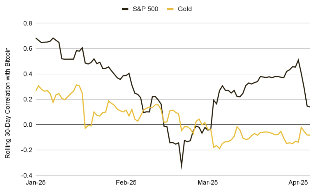 По их наблюдениям, первоначальная разрозненная реакция первой криптовалюты сменилась более плотным выравниванием BTC/S&P 500 по мере углубления тарифной войны, что контрастирует с неуклонно снижающейся корреляцией золота.