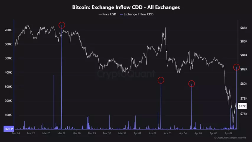 Участившийся перевод монет с кошельков на биржи подтвердил индикатор Exchange Inflow CDD. В предыдущий раз это предшествовало падению цены первой криптовалюты с $82 000 до $76 000, указали аналитики.
