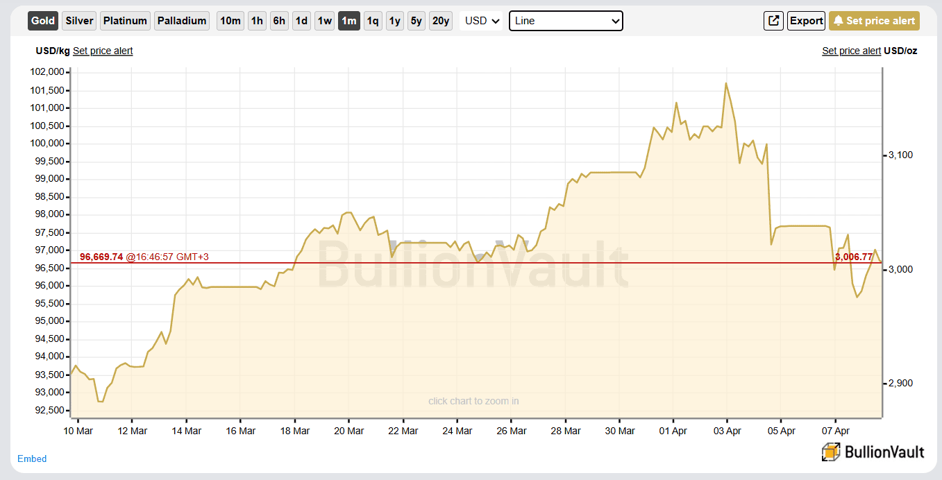 Отметим, обвал на фондовом рынке 6-7 апреля зацепил, в том числе, и драгоценный металл. Если в начале месяца актив отметился приростом, пробив отметку в $3163,25 за унцию, то в понедельник он упал до $2976,1, согласно BullionVault: