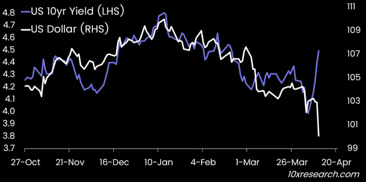 Индекс доллара США (DXY) составляет 100,337, что означает падение на 2,92% за последние пять дней, согласно данным TradingView. Аналитический ресурс The Kobeissi Letter написал 10 апреля на платформе X: «Доллар США покинул комнату. Снова что-то сломалось».