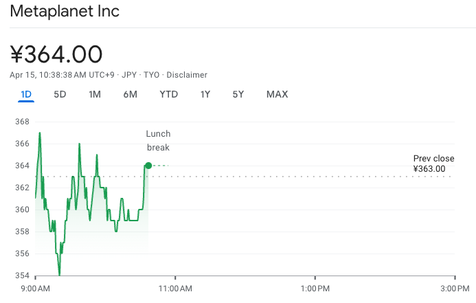Акции Metaplanet (3350) на Токийской фондовой бирже выросли на 3,71% после закрытия торгов 14 апреля, но упали на 0,5% к обеденному перерыву 15 апреля, согласно Google Finance.
