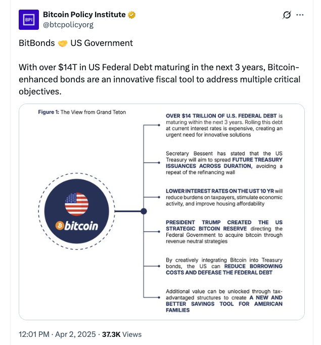 15 апреля на саммите Strategic Bitcoin Reserve Summit 2025 Мэтью Сигел представил концепцию «BitBonds» — казначейских облигаций США, привязанных к биткоину.