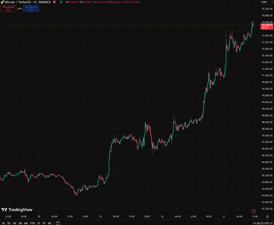 23 апреля цена первой криптовалюты преодолела отметку $94 000 после умиротворяющих заявлений президента США Дональда Трампа о тарифах и главе ФРС.