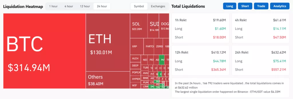 Примерно половина ликвидаций пришлась на биткоин ($314,9 млн).