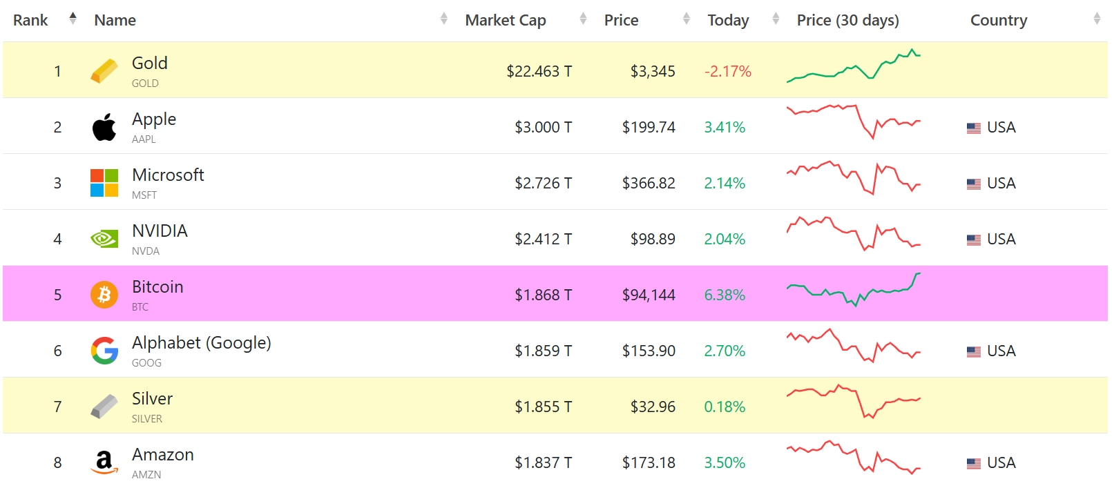 Впереди биткоина остаются еще 4 актива. Это золото и акции компаний Apple, Microsoft, NVIDIA.