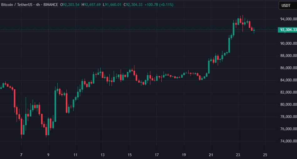 На момент написания первая криптовалюта торгуется вблизи отметки в $92 300: