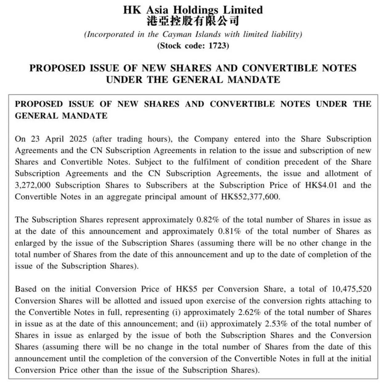 Сделка включает выпуск 3 272 000 новых акций по цене подписки 4,01 гонконгских долларов за акцию, а также конвертируемых облигаций общей стоимостью 52,38 млн гонконгских долларов. Недавно выпущенные акции составят около 0,82% от общего объема акций HK Asia Holdings в обращении.