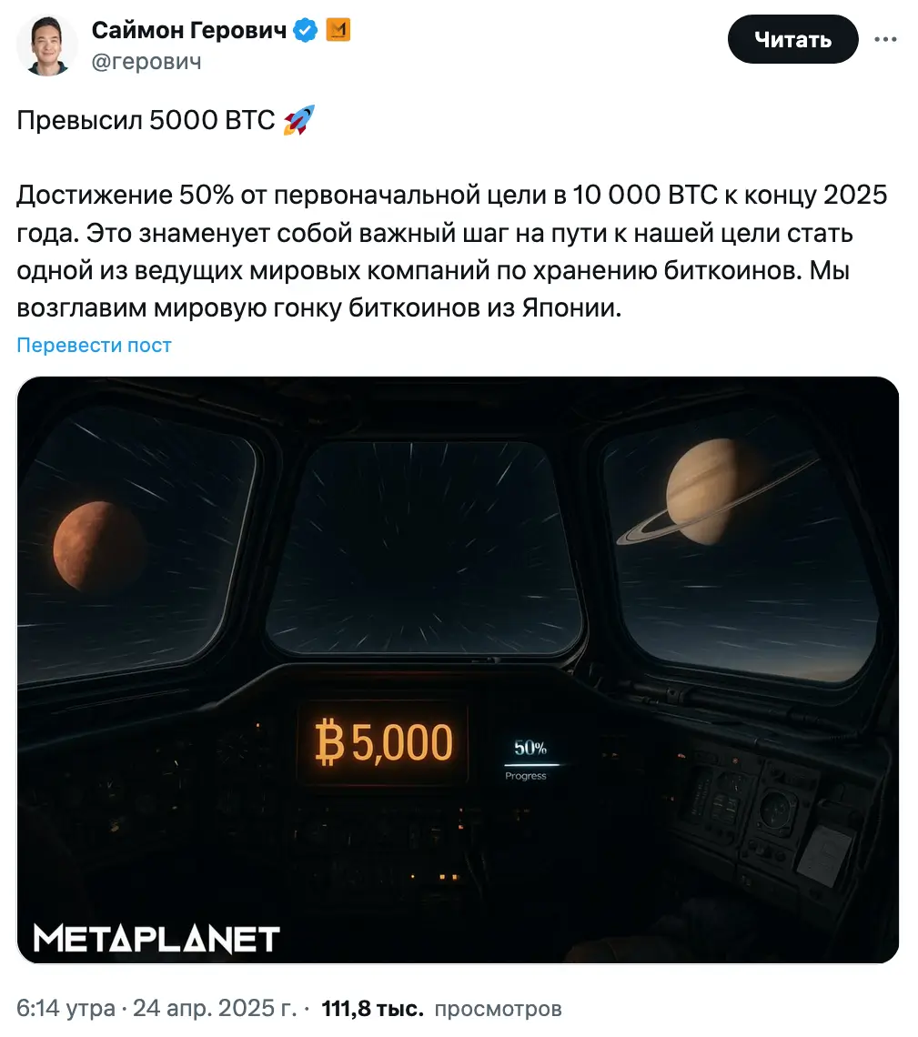 Генеральный директор Metaplanet Саймон Герович подтвердил, что компания достигла 50% от своей первоначальной цели — собрать 10 000 BTC к концу 2025 года.