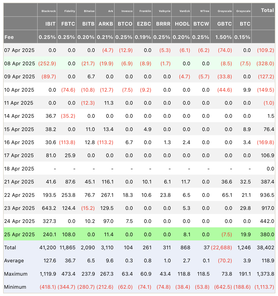 25 апреля 11 спотовых биткоин-ETF зафиксировали приток в размере $380 млн, что довело общую сумму за неделю примерно до $3,06 млрд за пять последовательных дней притока, согласно данным Farside. Последний раз спотовые биткоин-ETF имели полную неделю дней с притоком средств на неделе, закончившейся 21 марта.