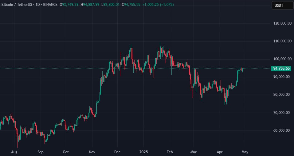 Отметим, на момент написания первая криптовалюта торгуется вблизи отметки в $94 800: