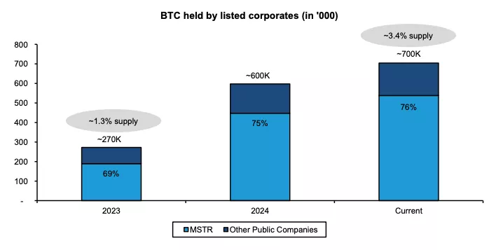 Сейчас около 80 публичных компаний владеют в общей сложности 700 000 BTC — 3,4% от теоретической эмиссии криптовалюты в 21 млн монет.