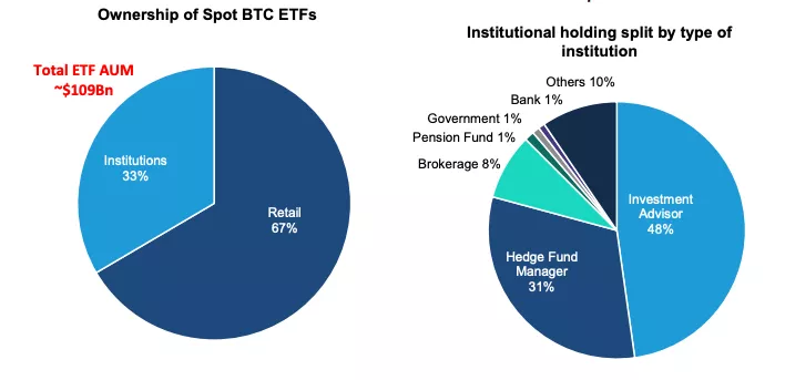 Среди учреждений 48% объемов биткоин-ETF удерживают инвестиционные консультанты, 31% — хедж-фонды.