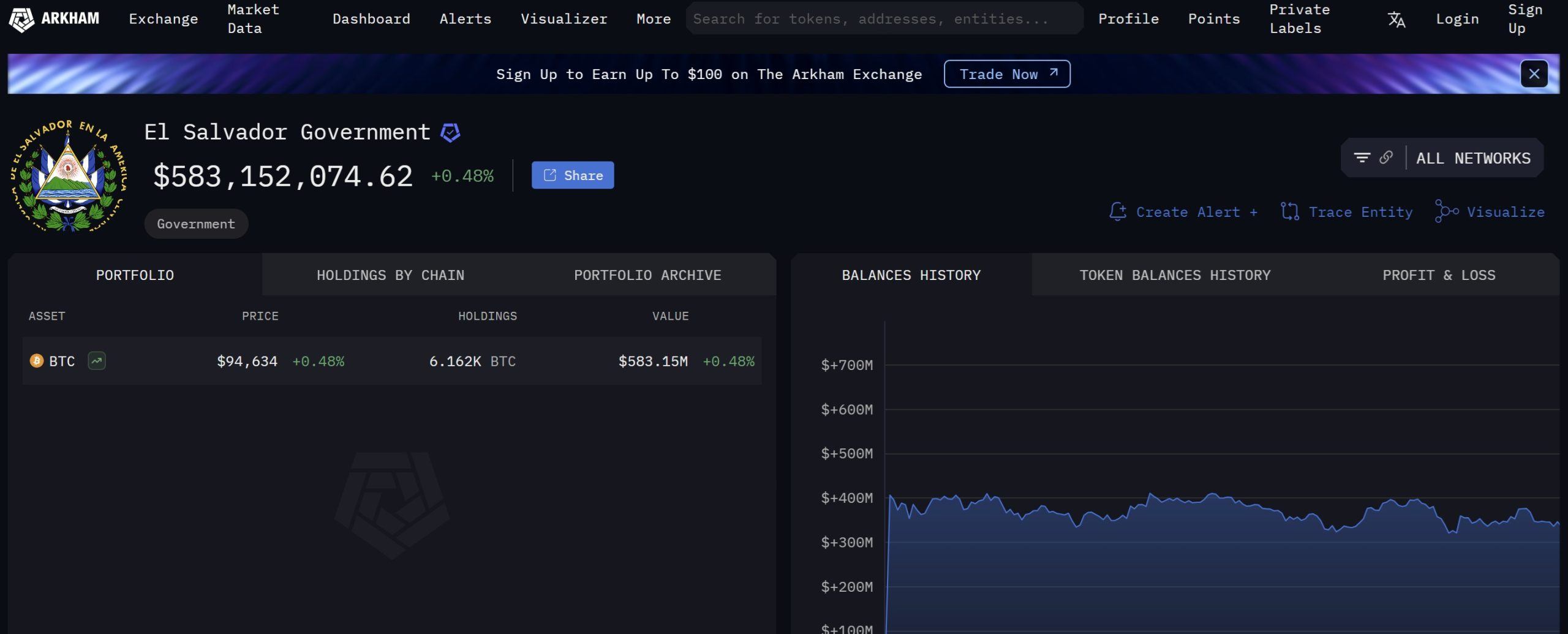 Согласно данным Arkham Intelligence, правительство Сальвадора в настоящее время владеет 6.162K BTC, стоимость которых составляет более 583 миллионов долларов на момент написания этой статьи, и накапливает их со скоростью 1 BTC в день.