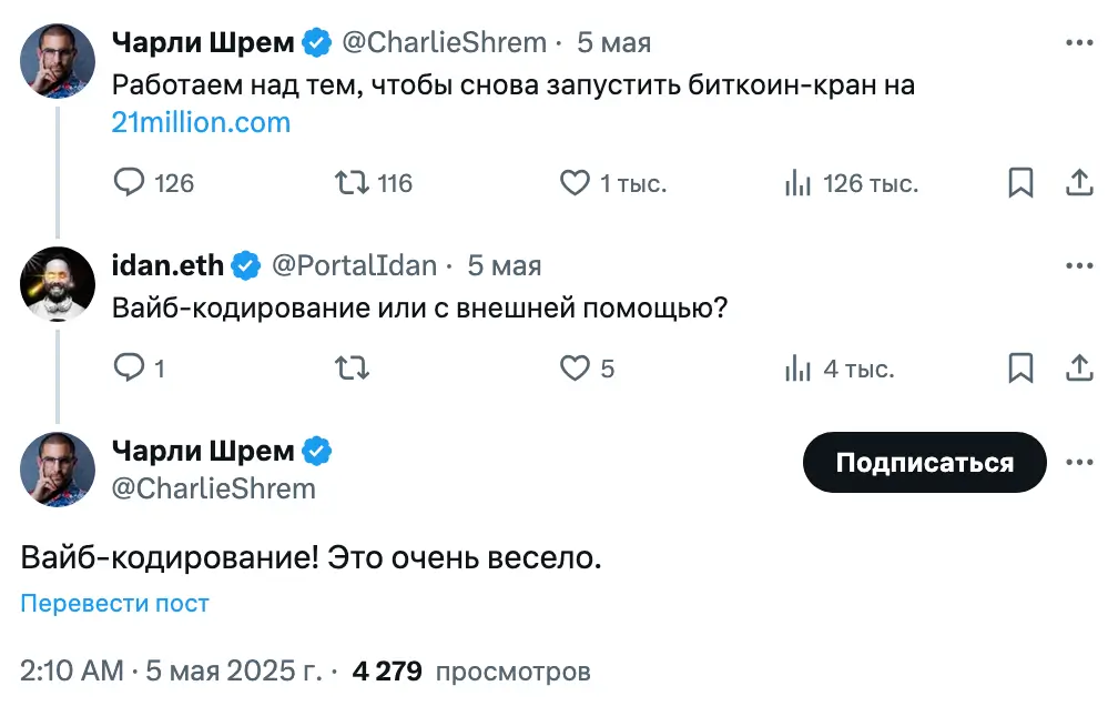 Когда его спросили, занимается ли Шрем «вайб-кодированием» проекта или получает внешнюю помощь, он ответил: «вайб-кодированием! Это очень весело». Вайб-кодирование основано на искусственном интеллекте и побуждении писать код.