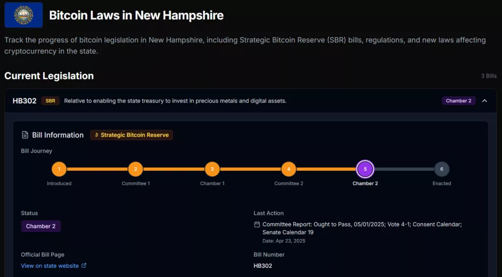 На федеральном уровне аналогичные проекты активнее всего продвигаются в Нью-Гэмпшире (HB 302), согласно Bitcoin Laws.