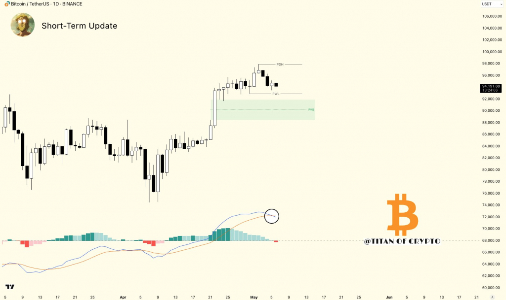«BTC консолидируется между максимумом и минимумом прошлой недели в ожидании завтрашнего заседания ФРС и выступления Пауэлла. Тем временем, дневной MACD продемонстрировал медвежье пересечение, указывая на замедление импульса», — резюмировал трейдер Titan of Crypto.